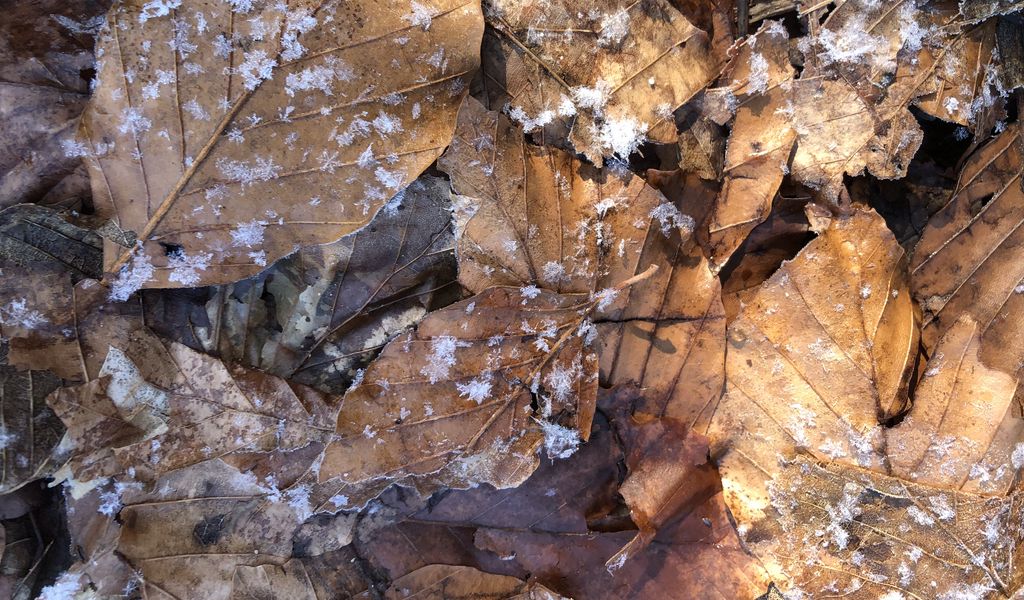 Download 1024x600 leaves, dry, snowflakes, snow wallpaper, background netbook, tablet