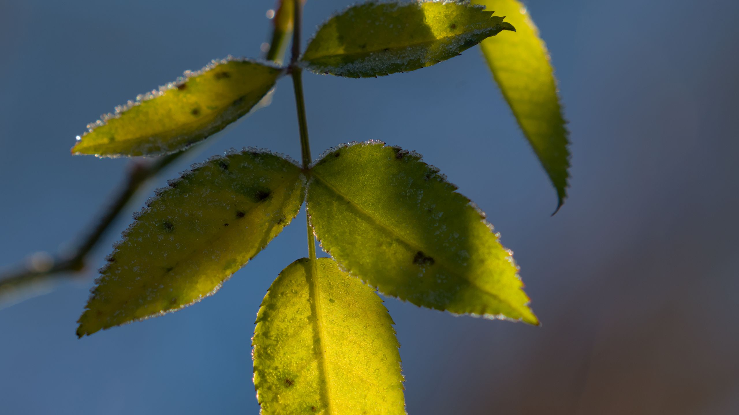 Download 2560x1440 leaves, plant, macro, frost, green wallpaper, background widescreen 16:9