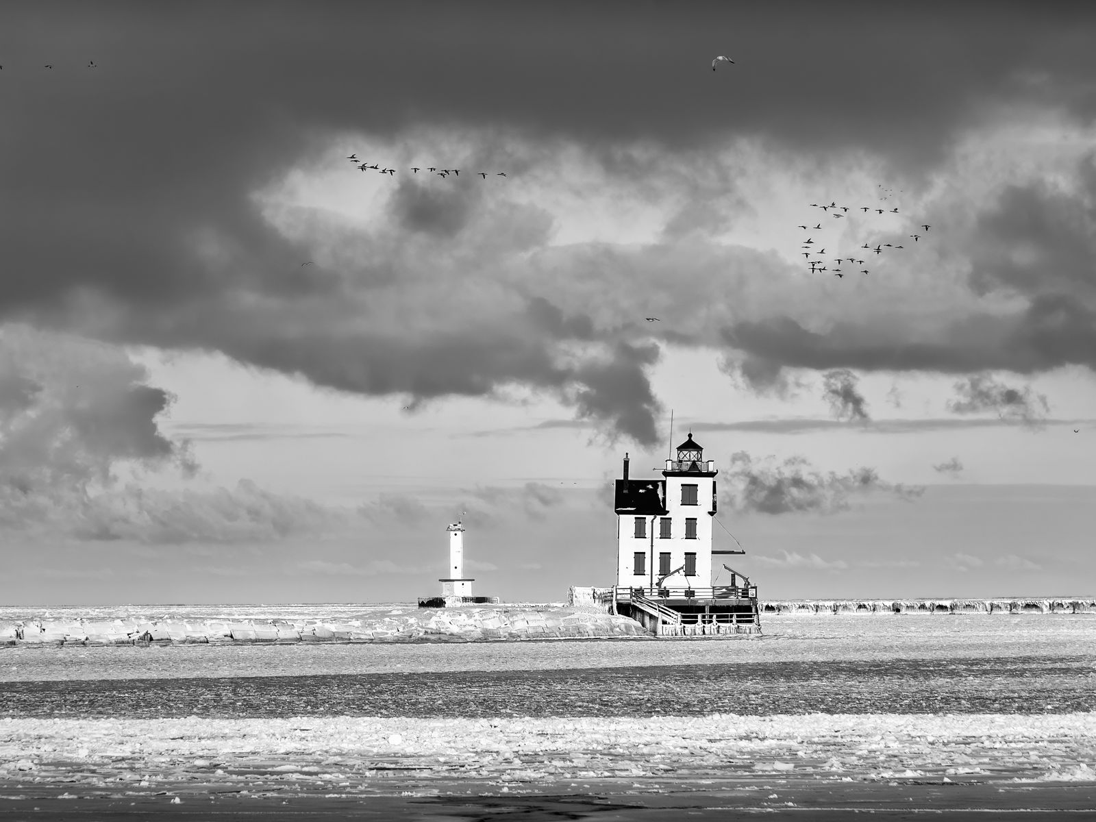 Download 1600x1200 lighthouse, building, shore, sea, birds, sky, black and white wallpaper, background standard 4:3