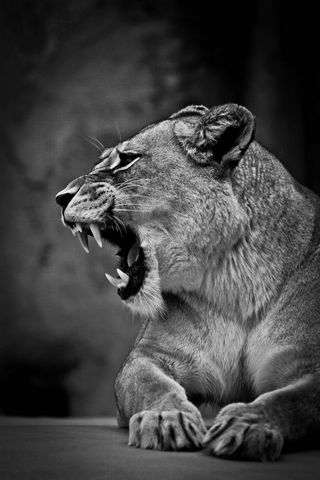 Download 320x480 lion, lioness, grin, bw, predator, big cat wallpaper, background samsung galaxy ace gt-s5830, sony xperia e, miro, htc wildfire s, c, lg optimus
