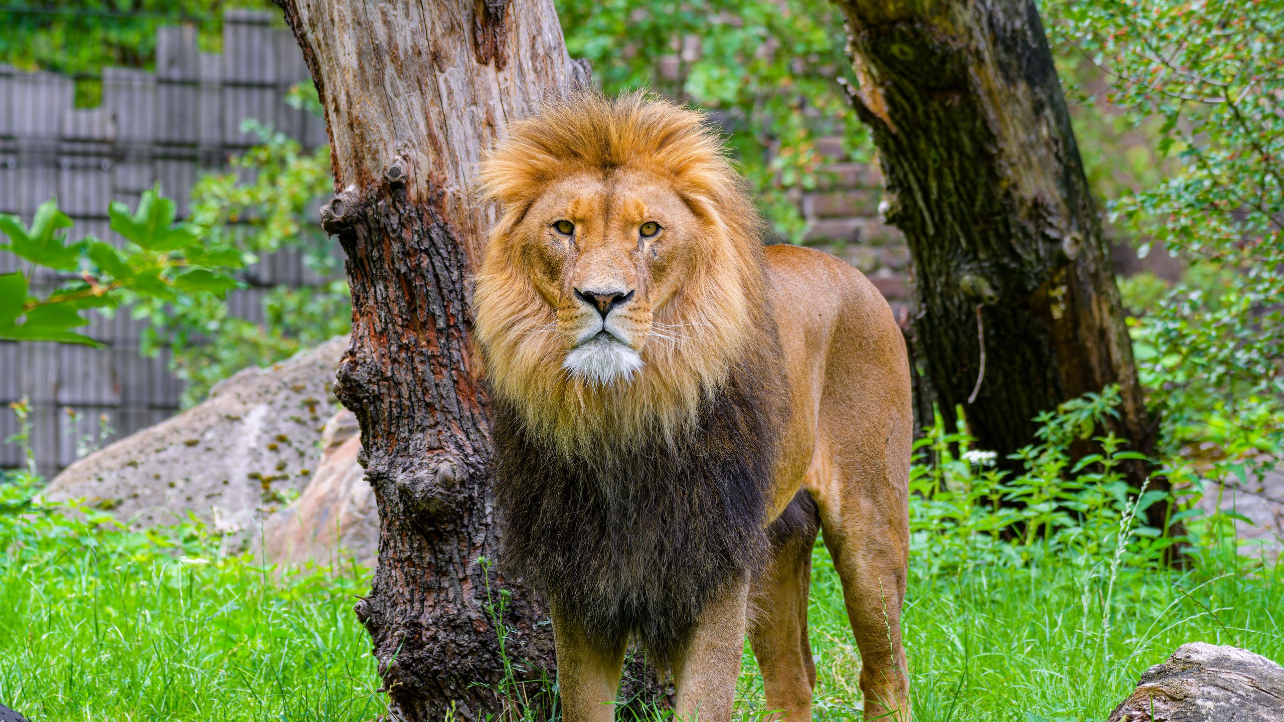 Download 2560x1440 lion, predator, wild animal, grass, tree wallpaper, background widescreen 16:9