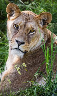 Download 240x400 lioness, glance, grass, animal, predator wallpaper, background nokia asha 311, samsung galaxy 580, omnia, lg kp500