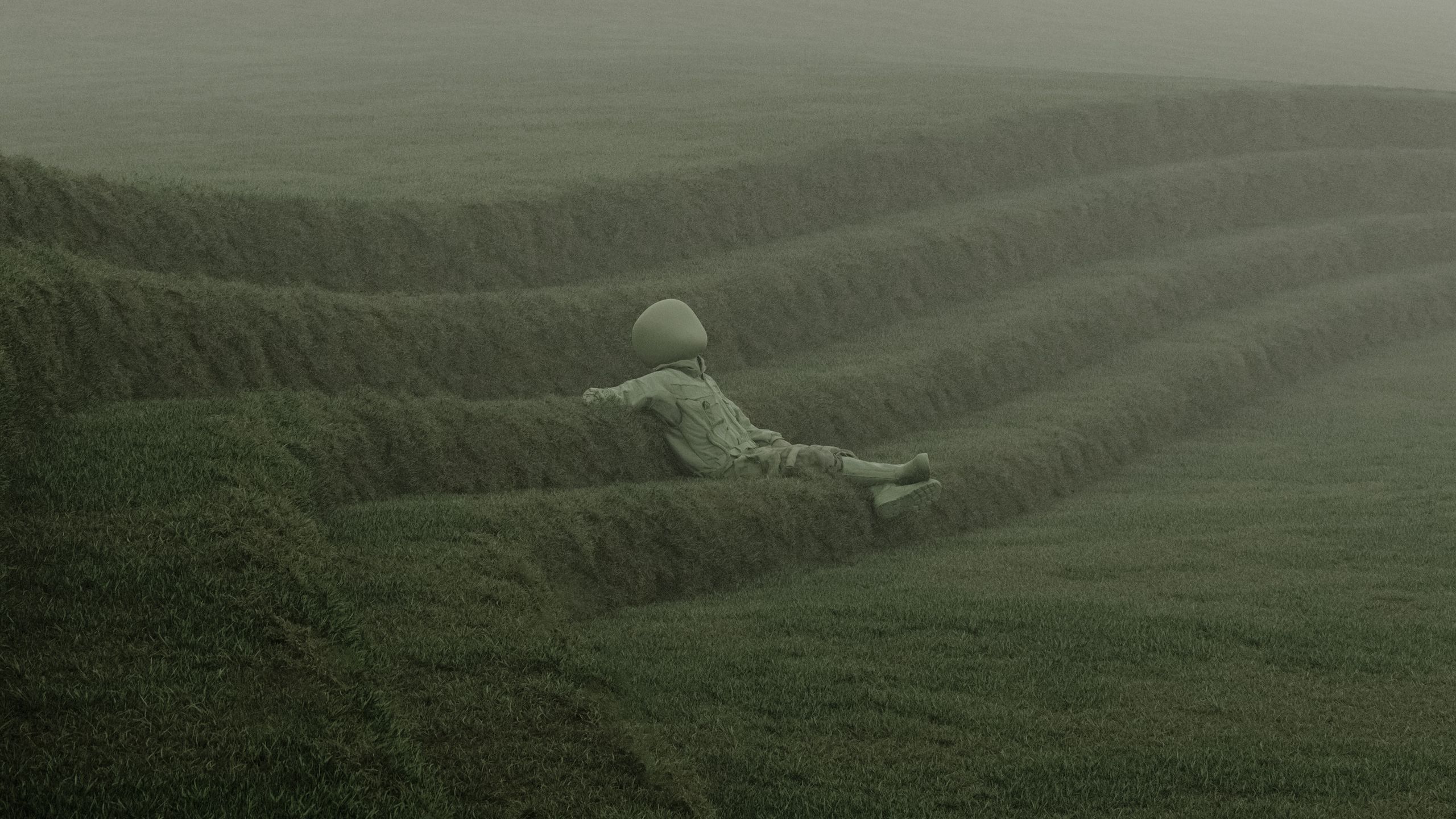 Download 2560x1440 man, pose, grass, lawn, art wallpaper, background widescreen 16:9