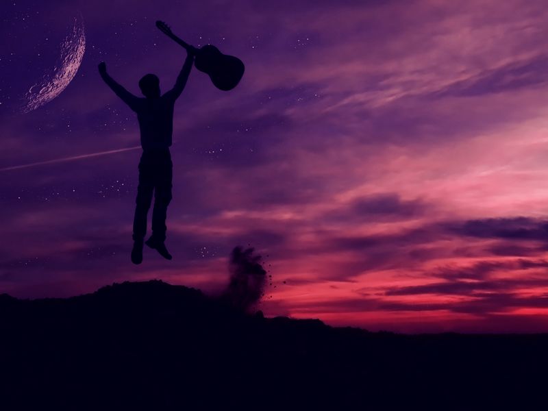 Download 800x600 man, silhouette, guitar, stars, jump, moon, happiness, night wallpaper, background pocket pc, pda