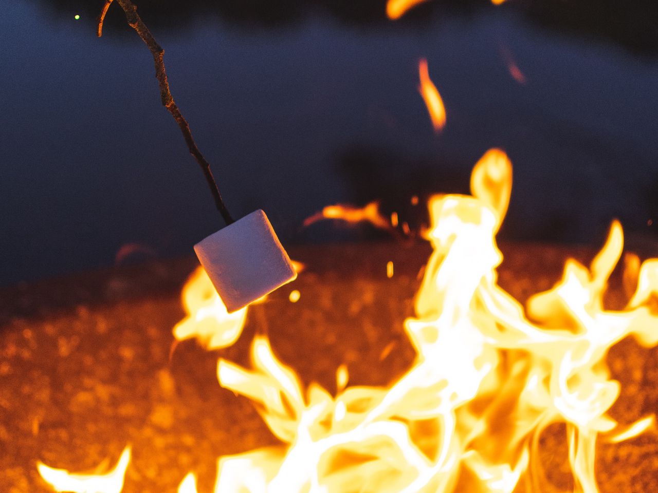 Download 1280x960 marshmallow, bonfire, camping, evening wallpaper, background standard 4:3