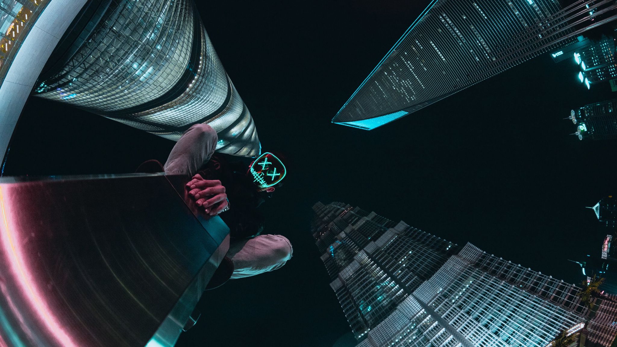 Download 2048x1152 mask, skyscrapers, anonymous, architecture, bottom view wallpaper, background ultrawide monitor