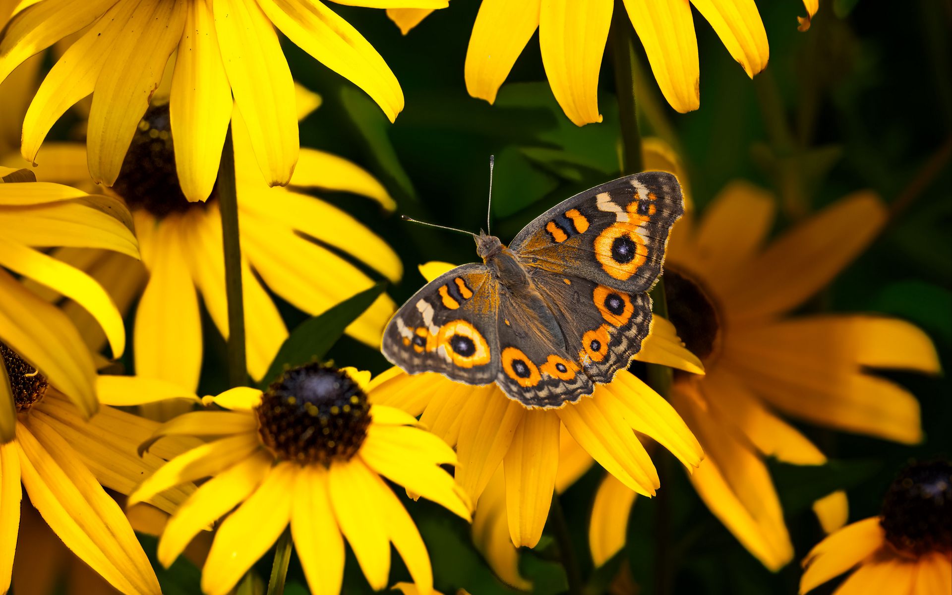 Download 1920x1200 meadow argus, rudbeckia, butterfly, flowers, petals, garden, insect wallpaper, background widescreen 16:10