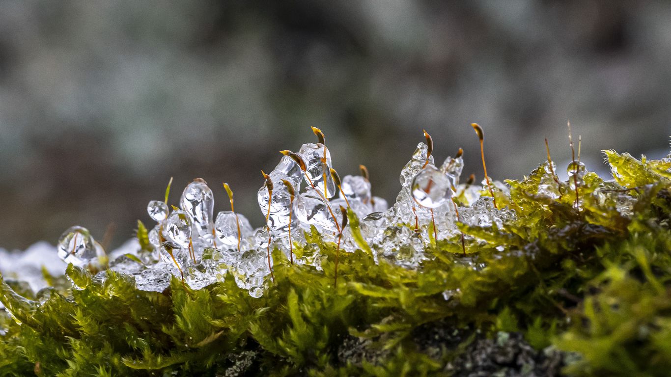Download 1366x768 moss, ice, drops, water wallpaper, background tablet, laptop