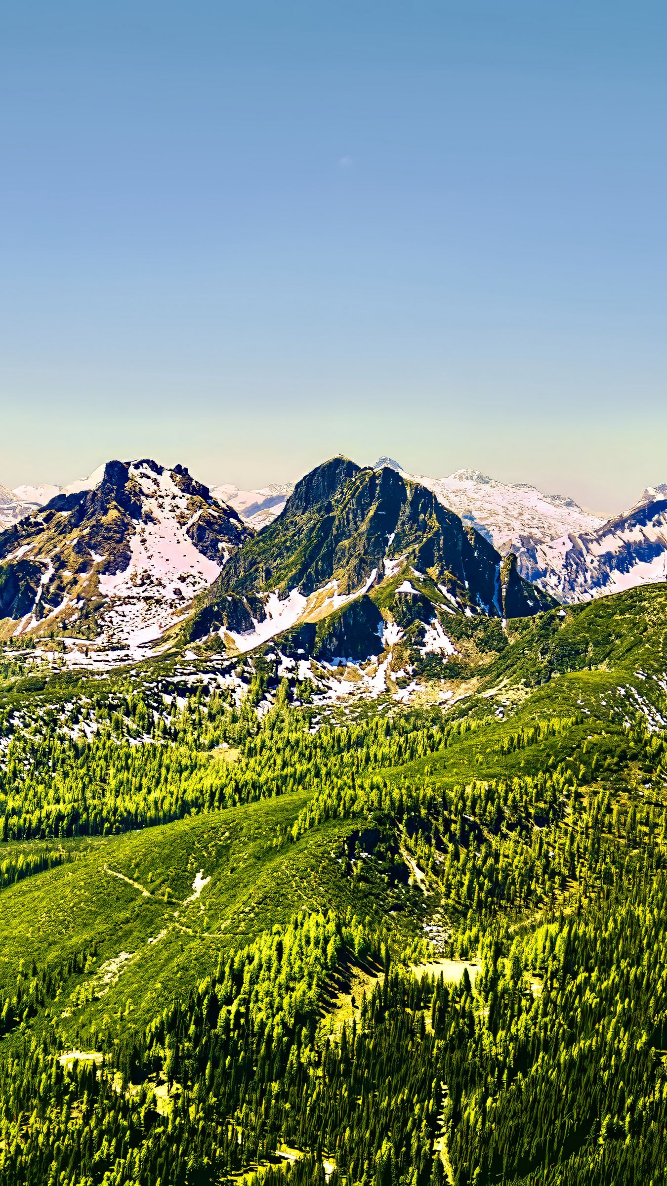 Download 1350x2400 mountains, nature, landscape, forest, blue sky, snow wallpaper, background iphone 8+/7+/6s+/6+ for parallax