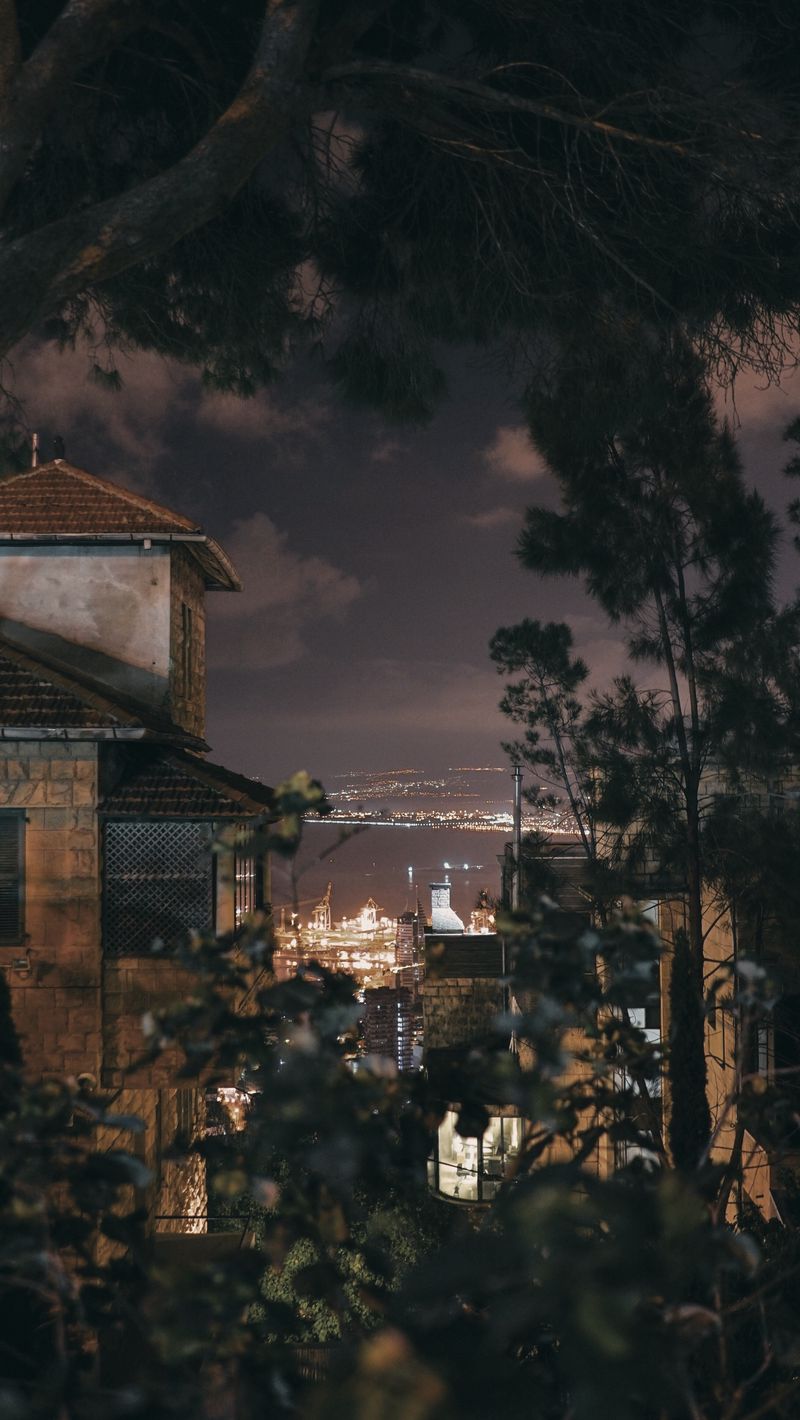 Download 800x1420 night, branches, city, sea, trees wallpaper, background iphone se/5s/5c/5 for parallax