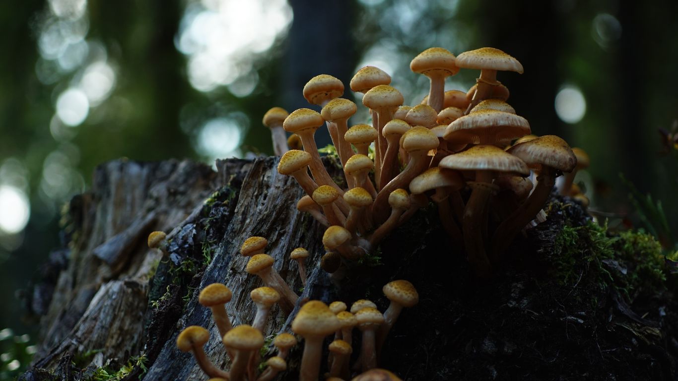 Download 1366x768 northern honey fungus, honey fungus, mushrooms, macro, stump, moss, nature wallpaper, background tablet, laptop