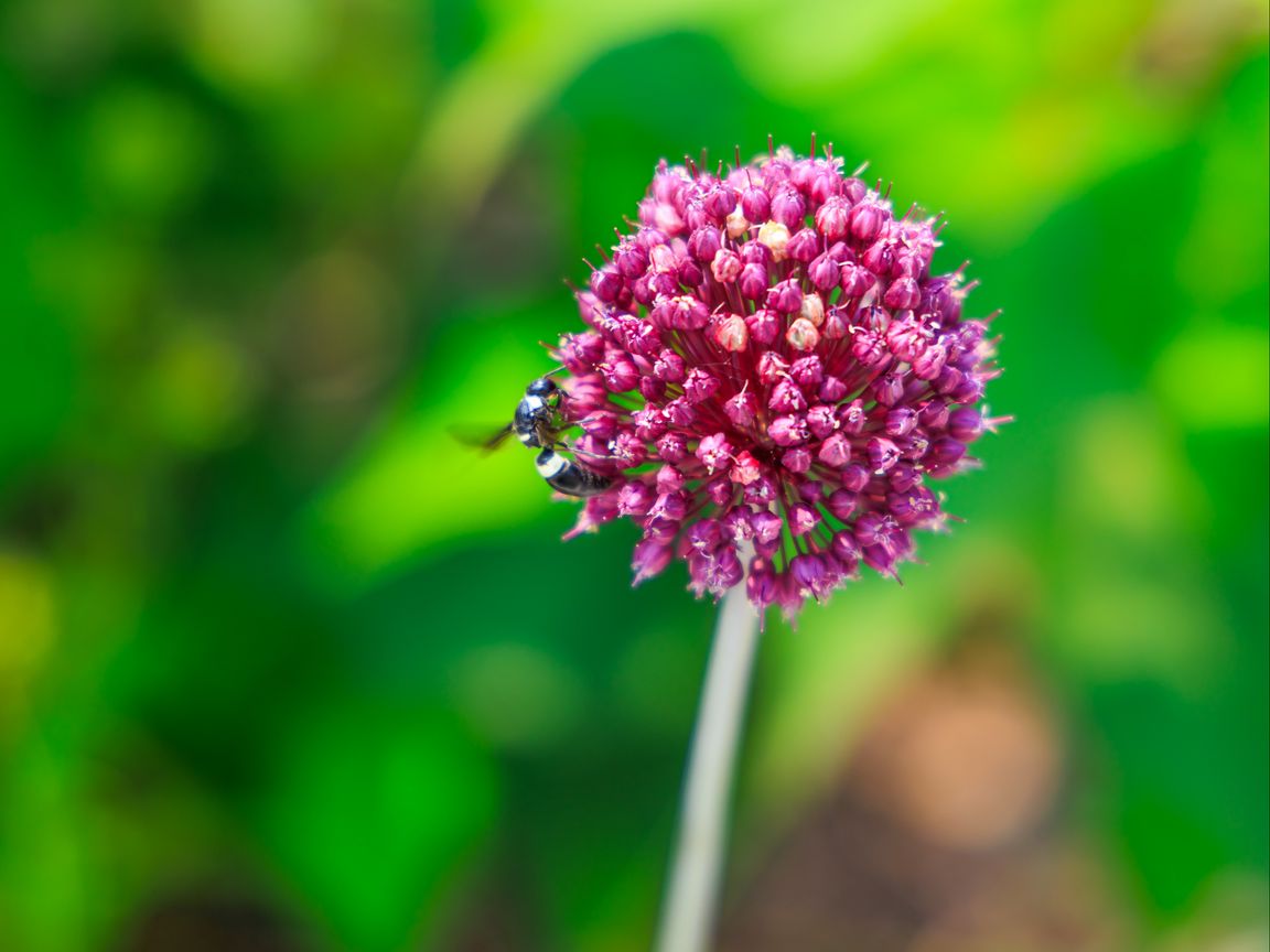 Download 1152x864 onion, flower, bee, macro, purple wallpaper, background standard 4:3