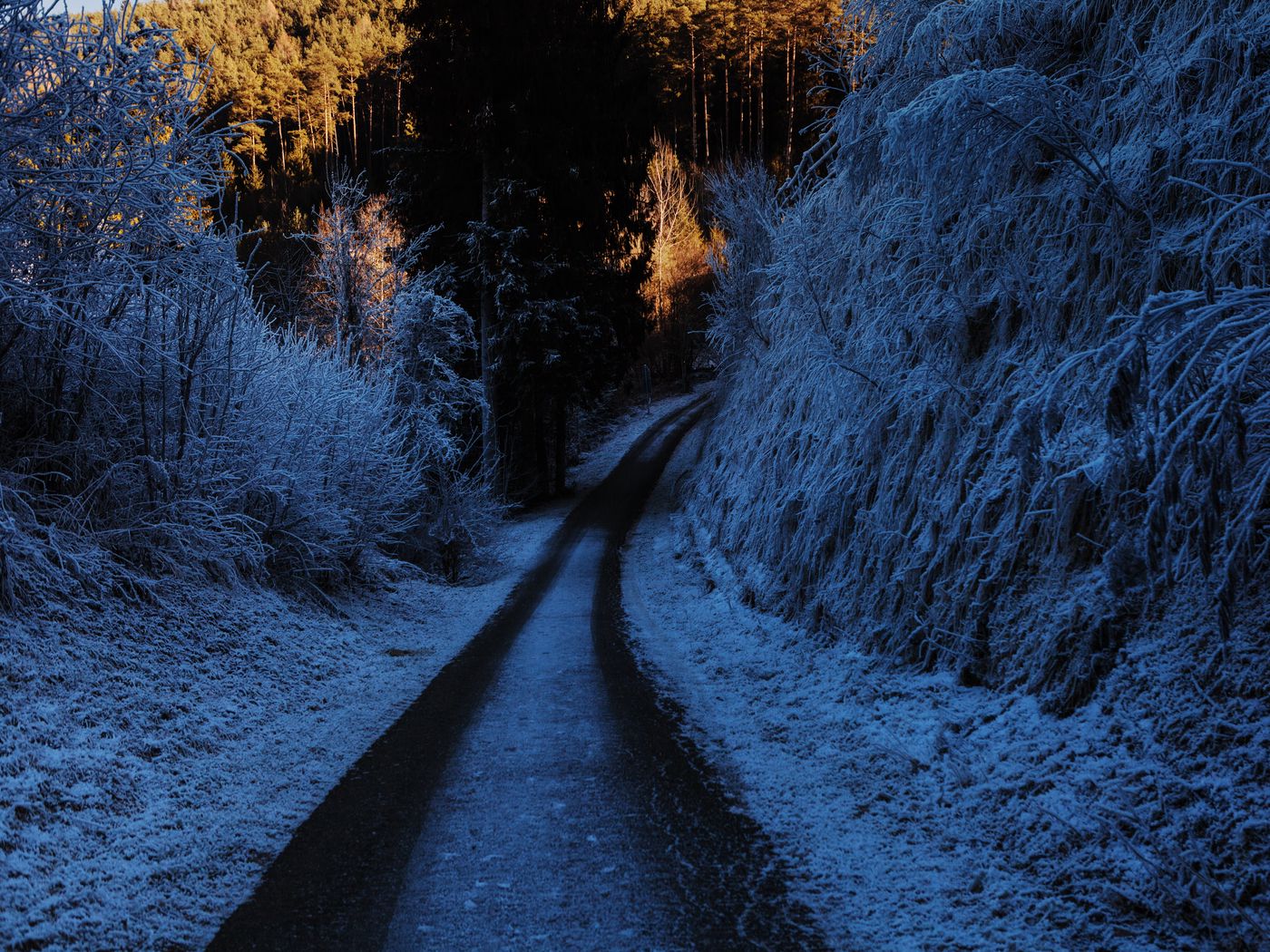 Download 1400x1050 path, turn, winter, forest, trees wallpaper, background standard 4:3