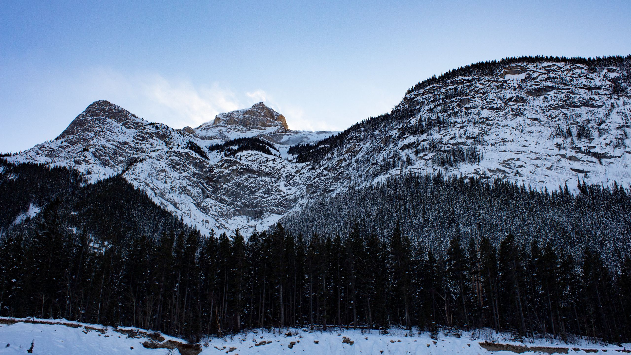Download 2560x1440 peaks, snowy, forest, trees wallpaper, background widescreen 16:9