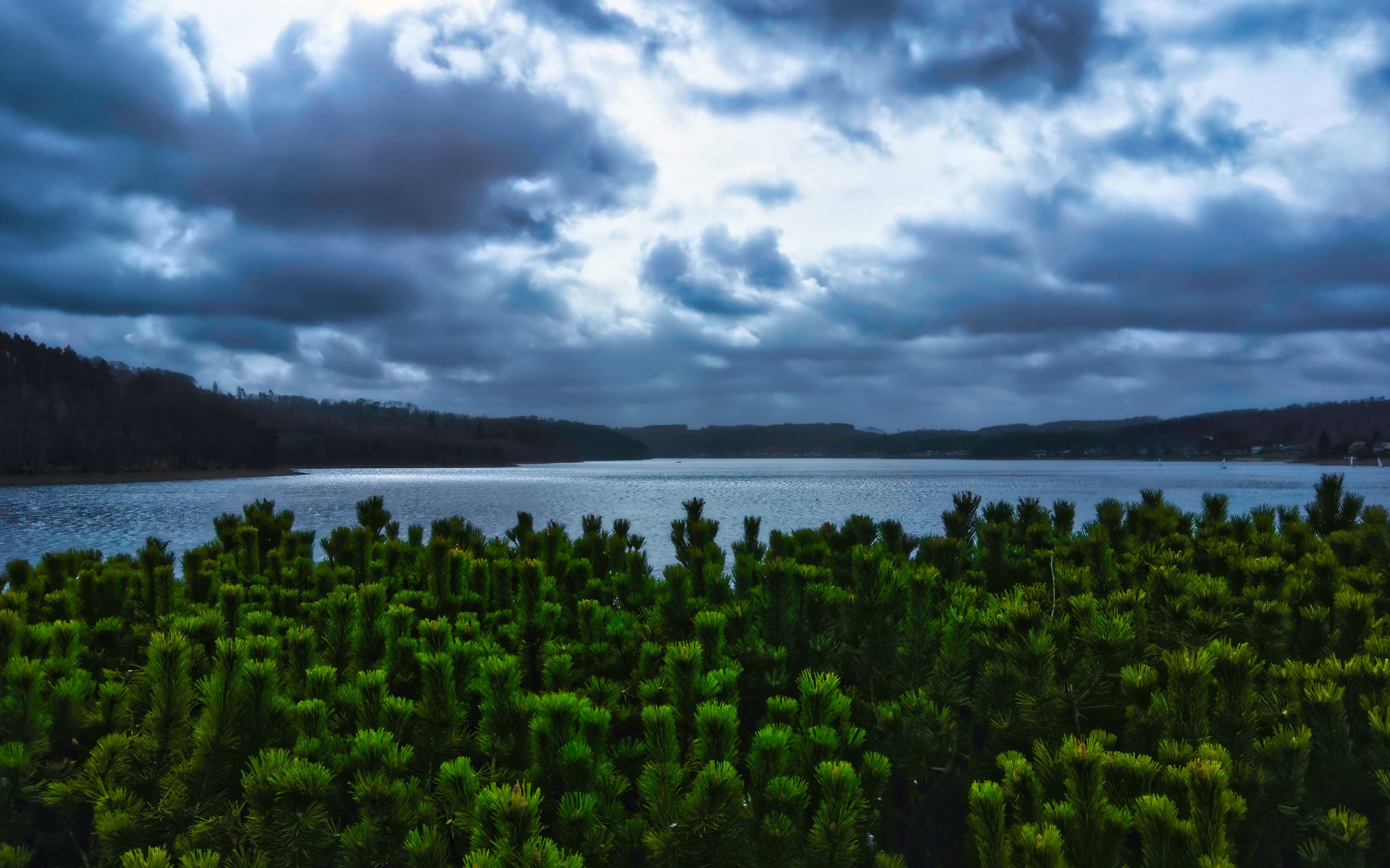Download 3840x2400 pines, trees, branches, lake, clouds, landscape wallpaper, background 4k ultra hd 16:10