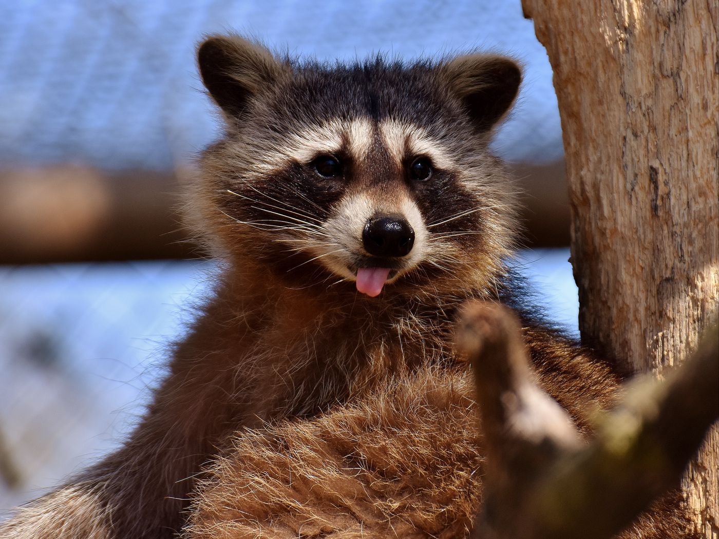 Download 1400x1050 raccoon, protruding tongue, muzzle wallpaper, background standard 4:3