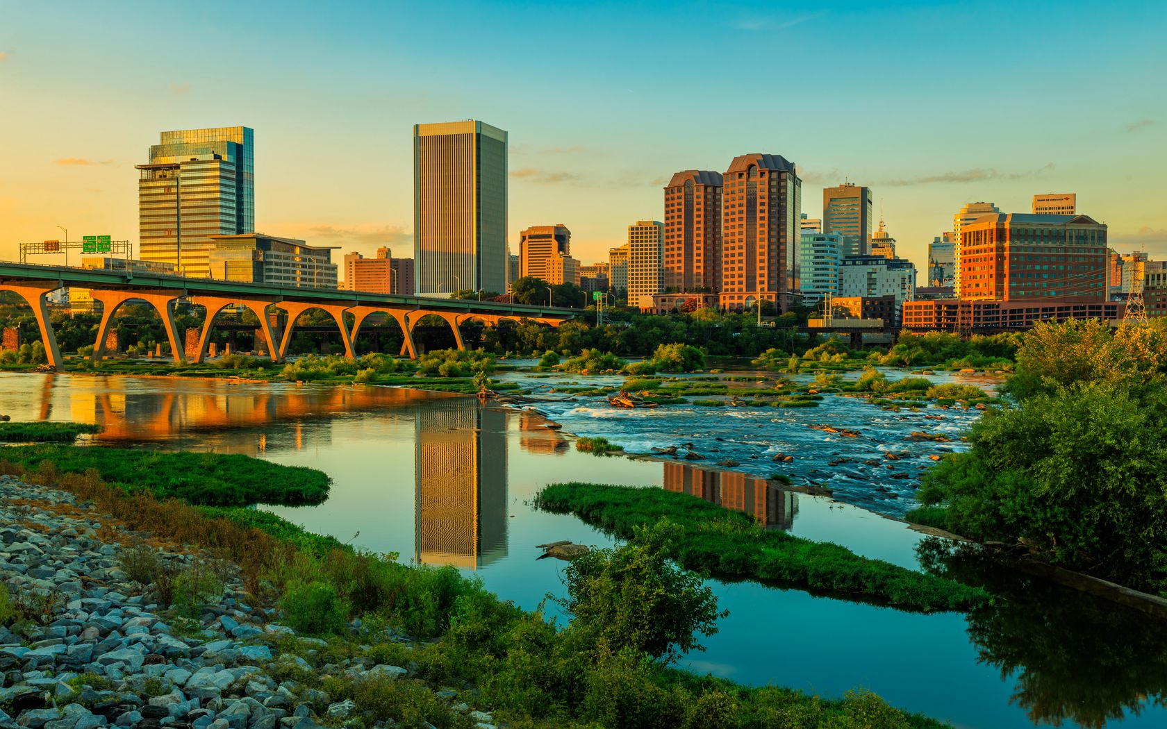 Download 1680x1050 river, greens, bridge, buildings, city, sunset wallpaper, background widescreen 16:10