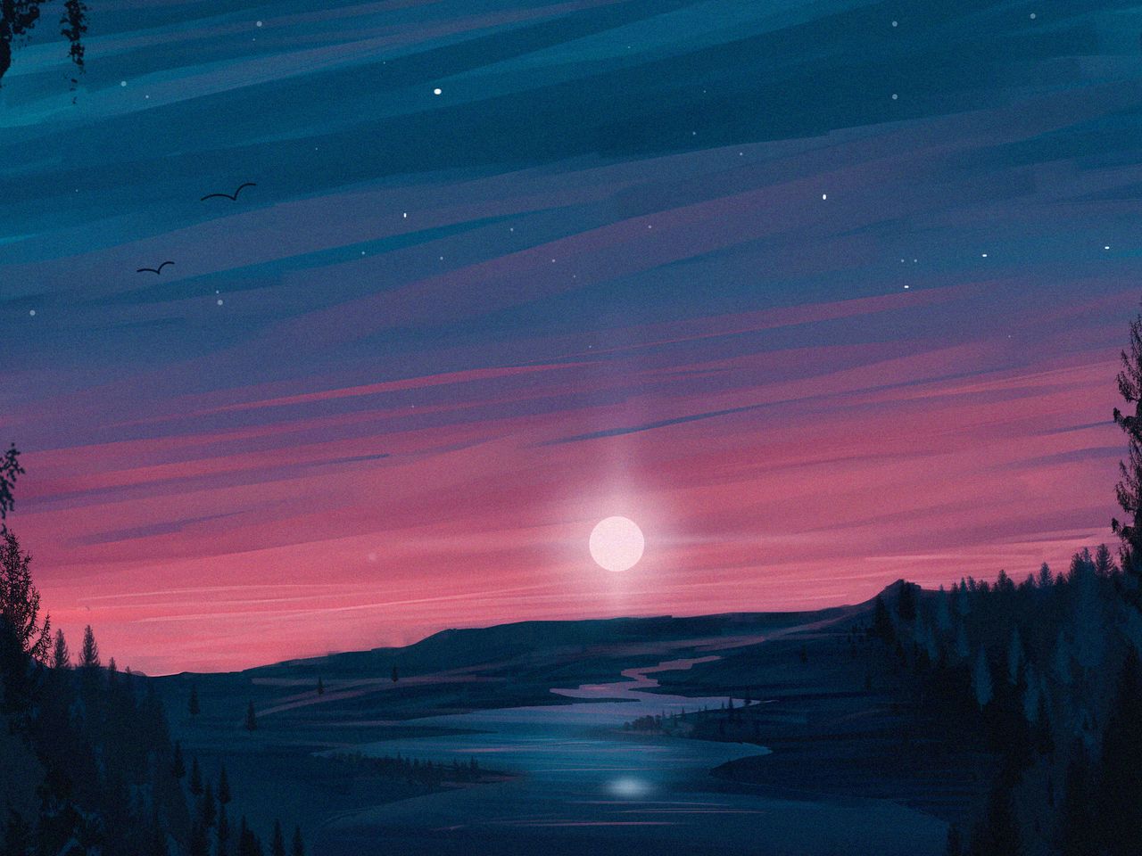 Download 1280x960 river, moon, night, landscape, art wallpaper, background standard 4:3