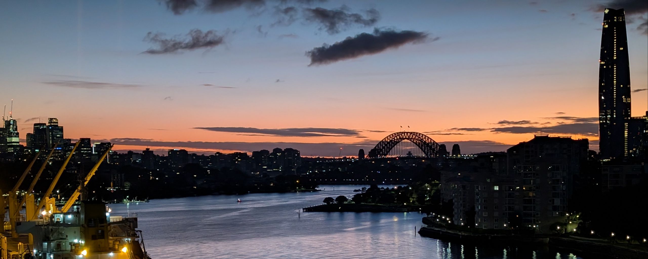 Download 2560x1024 river, ship, bridge, city, sunset, dark wallpaper, background ultrawide monitor