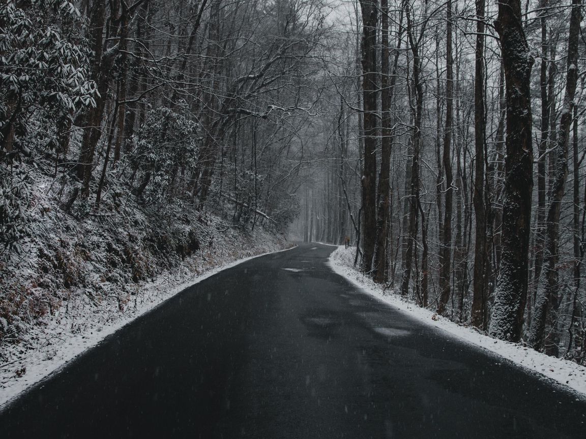 Download 1152x864 road, turn, trees, snow, overcast wallpaper, background standard 4:3