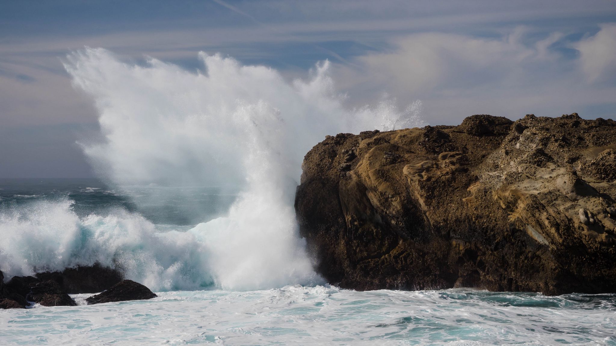 Download 2048x1152 rock, sea, splashes, foam, wave wallpaper, background ultrawide monitor