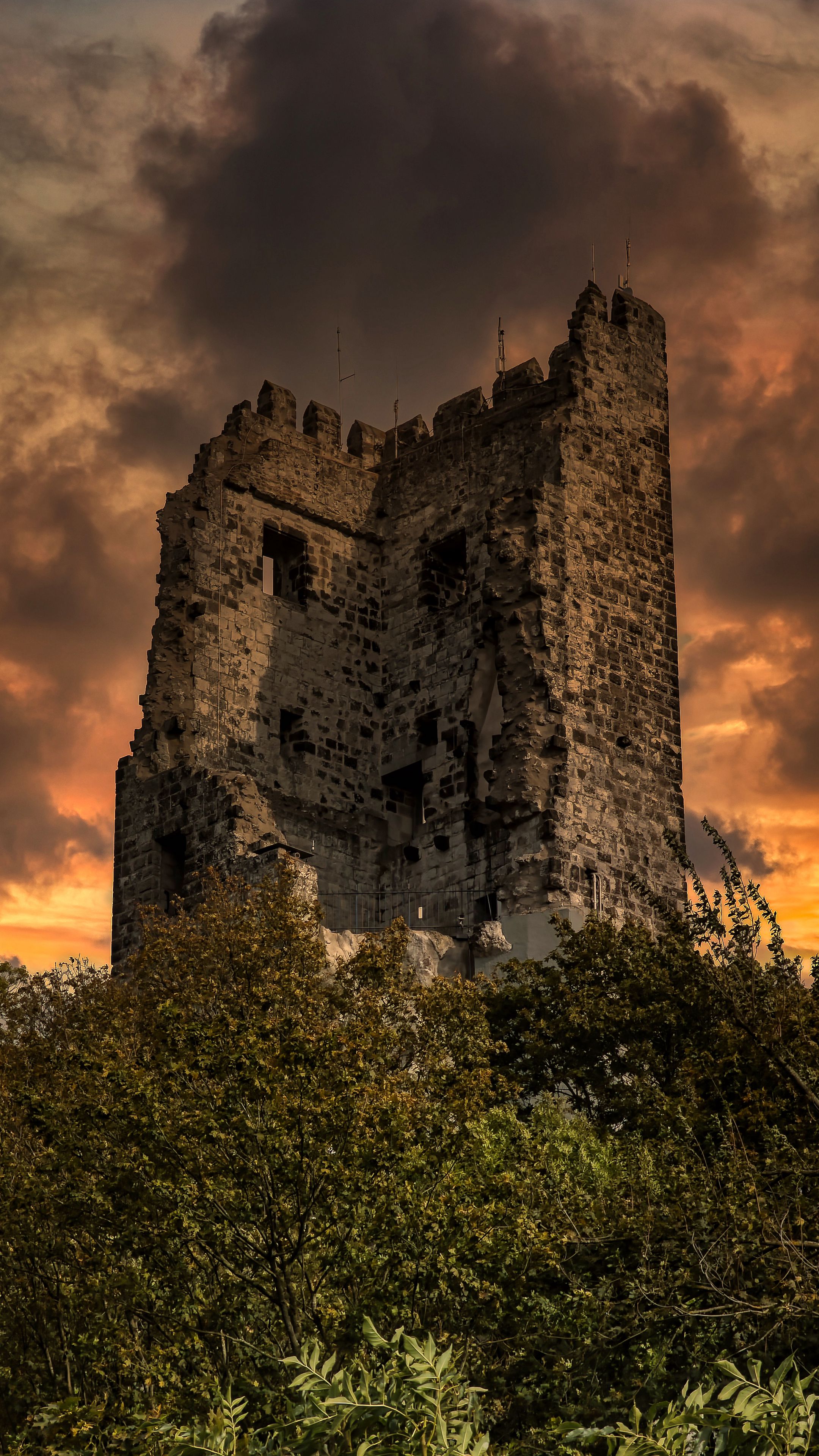Download 2160x3840 ruins, trees, sunset, landscape wallpaper, background samsung galaxy s4, s5, note, sony xperia z, z1, z2, z3, htc one, lenovo vibe