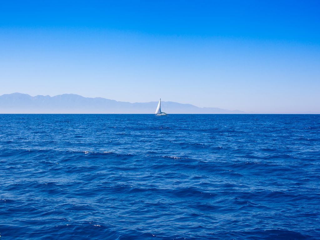 Download 1024x768 sail, boat, sea, mountains, landscape, minimalism wallpaper, background standard 4:3