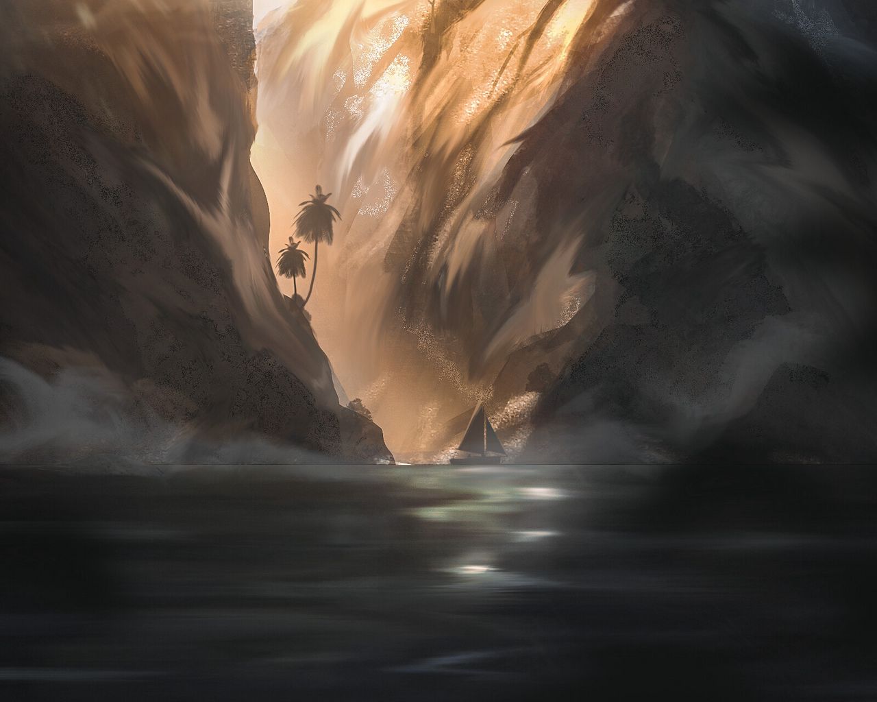 Download 1280x1024 sailboat, boat, mountains, water, art wallpaper, background standard 5:4