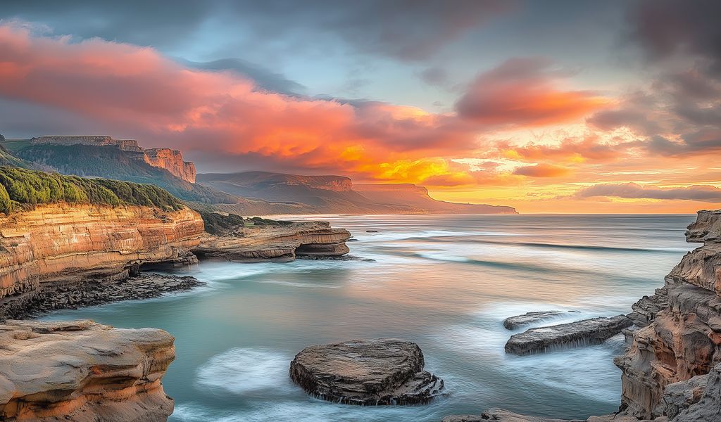 Download 1024x600 sea, bay, rocks, clouds wallpaper, background netbook, tablet