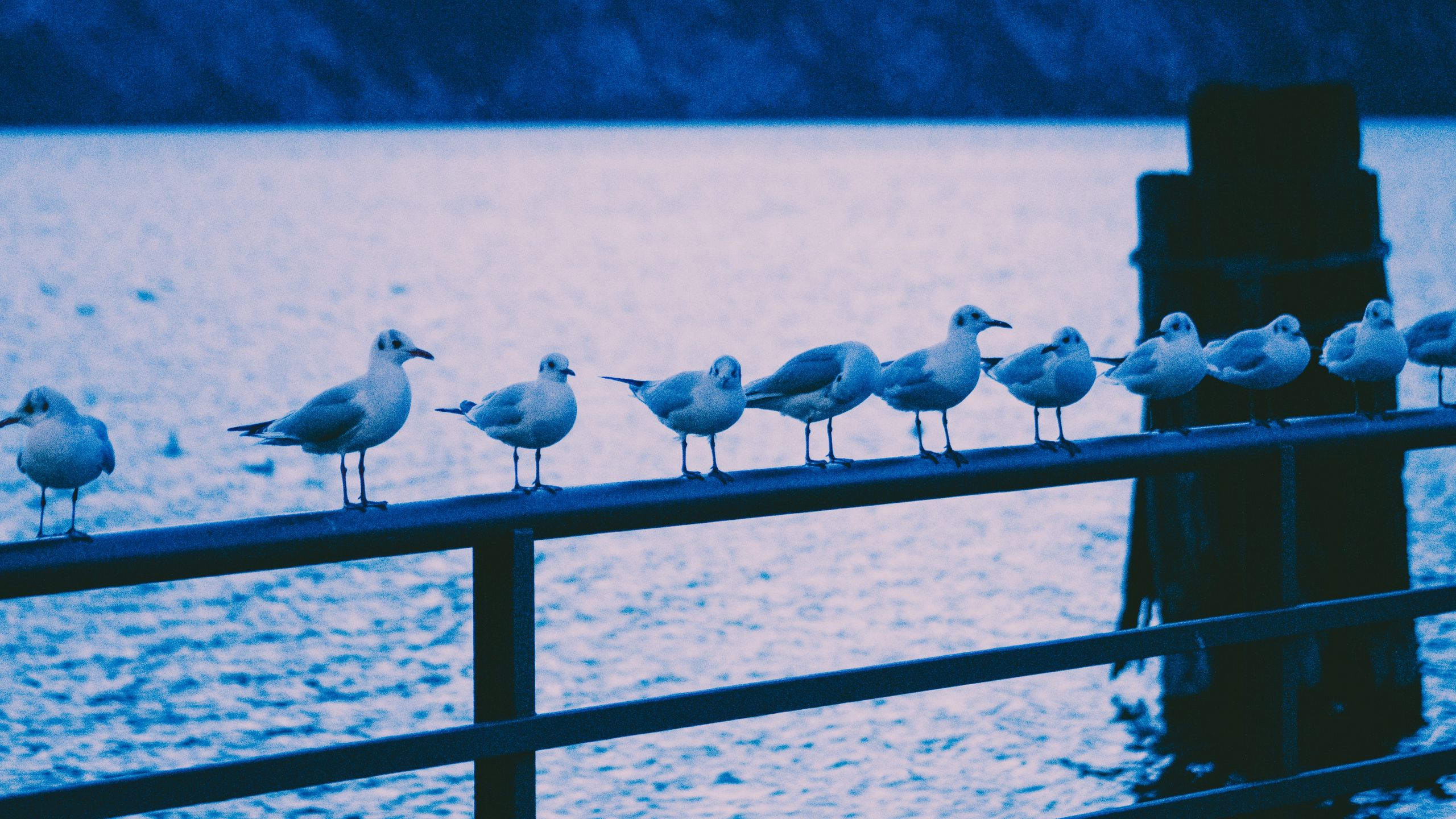 Download 2560x1440 seagulls, birds, railing, sea, shore wallpaper, background widescreen 16:9