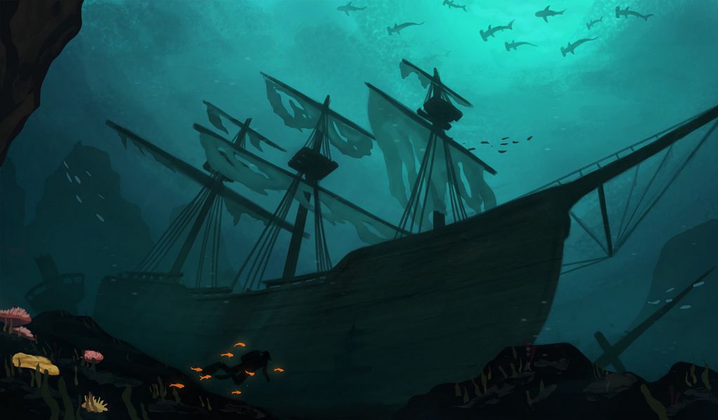 Download 1024x600 ship, diver, fish, underwater, art wallpaper, background netbook, tablet