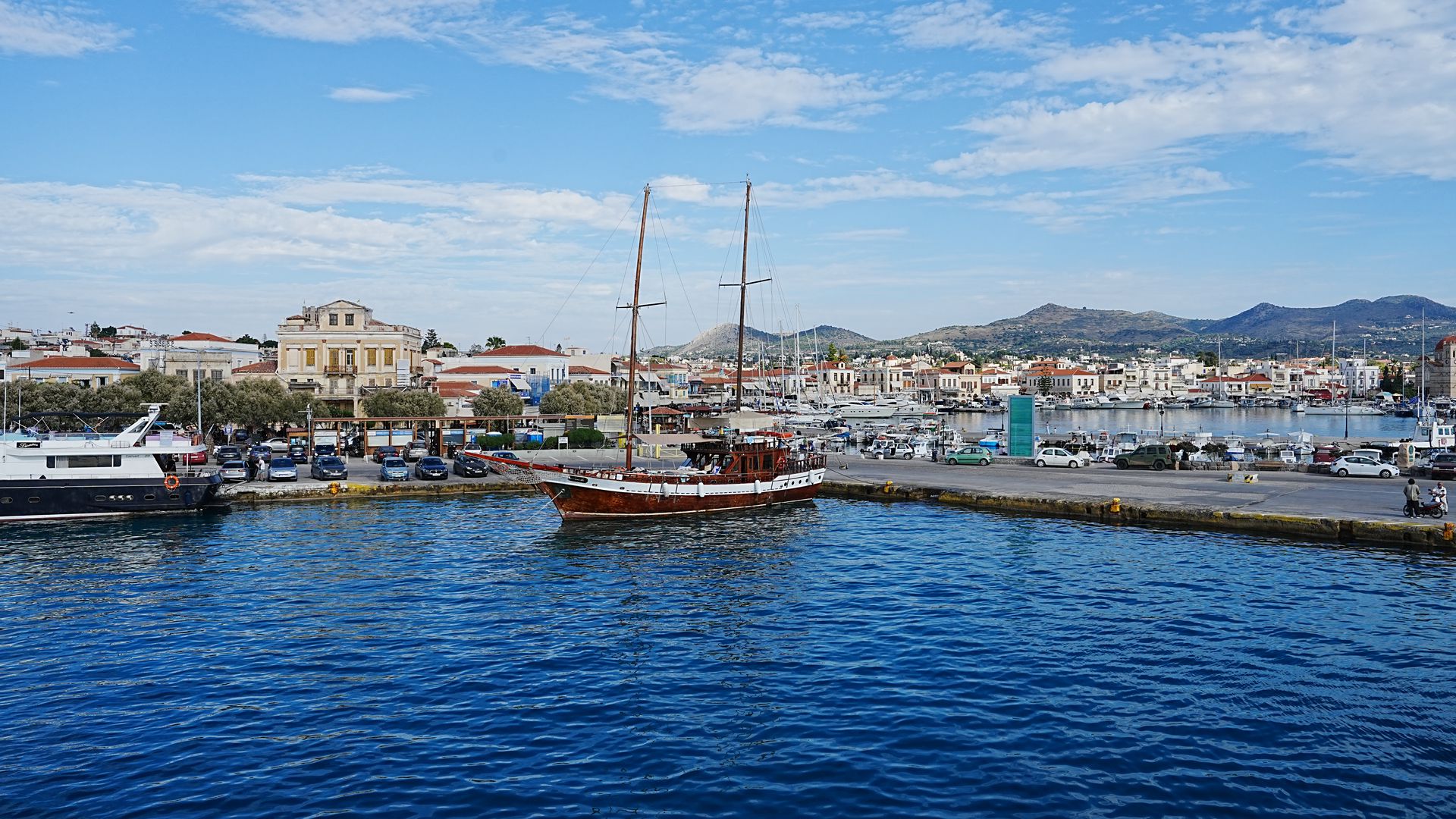 Download 1920x1080 ship, masts, sea, houses, embankment wallpaper, background full hd, hdtv, fhd, 1080p