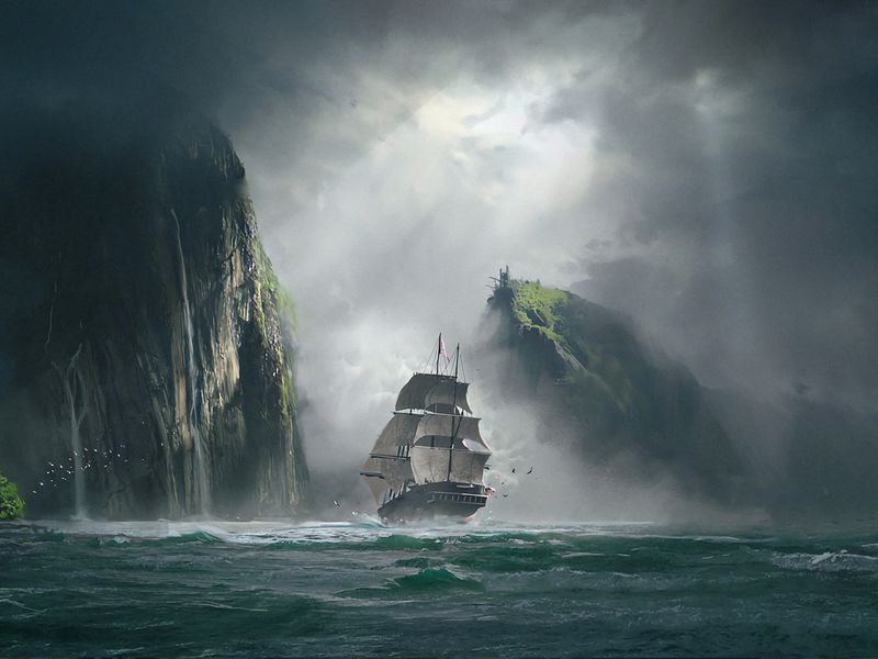 Download 800x600 ship, sea, rocks, fog, art wallpaper, background pocket pc, pda