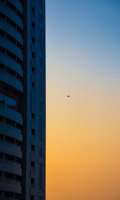 Download 240x400 skyscraper, airplane, dawn, minimalism wallpaper, background nokia asha 311, samsung galaxy 580, omnia, lg kp500