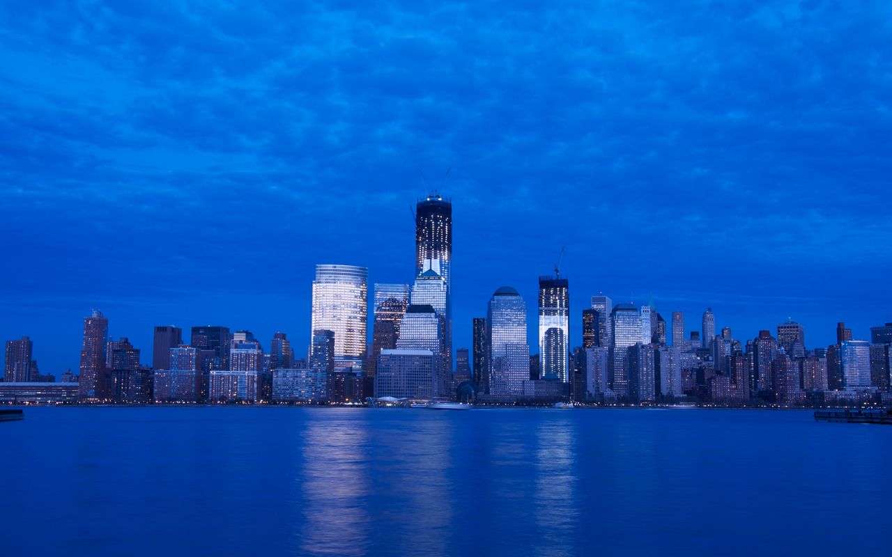 Download 1280x800 skyscraper, buildings, river, lights, evening, blue wallpaper, background widescreen 16:10