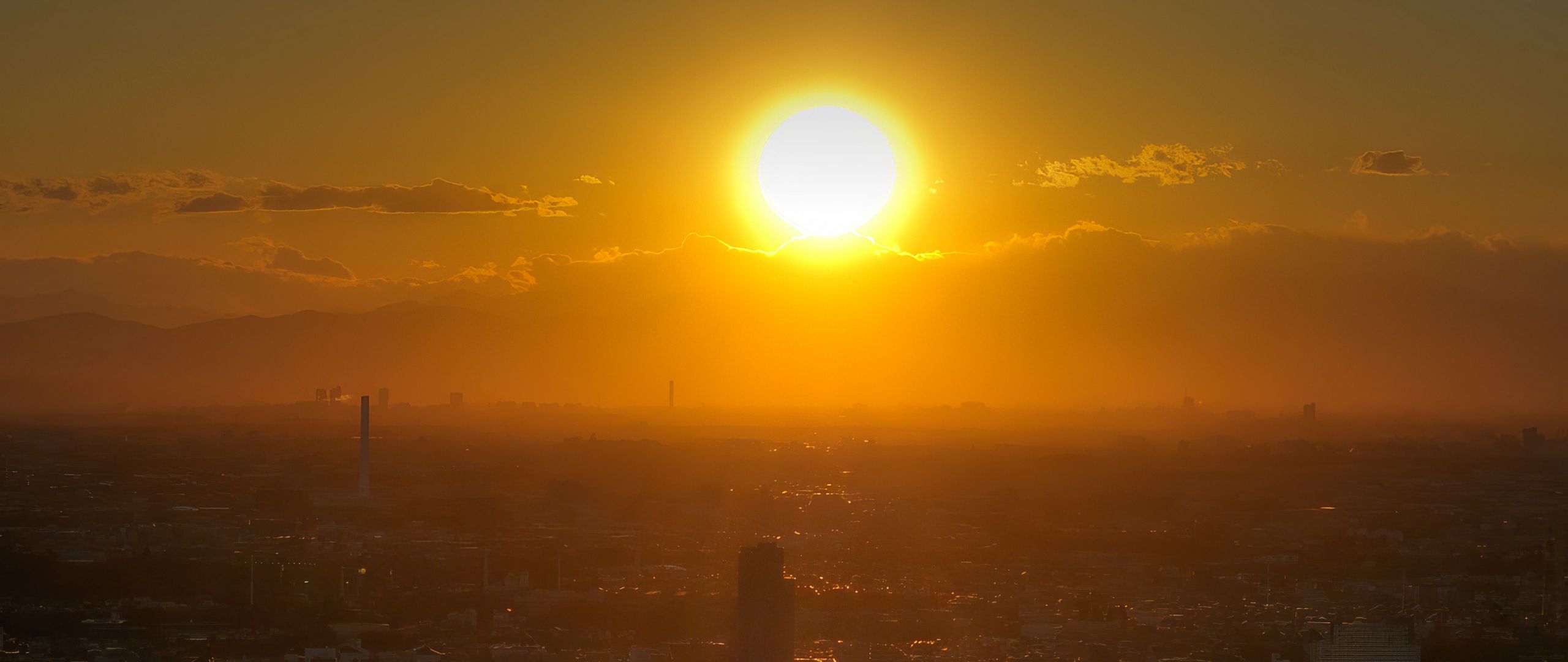 Download 2560x1080 skyscrapers, city, aerial view, sunrise, sun, sky wallpaper, background dual wide 1080p