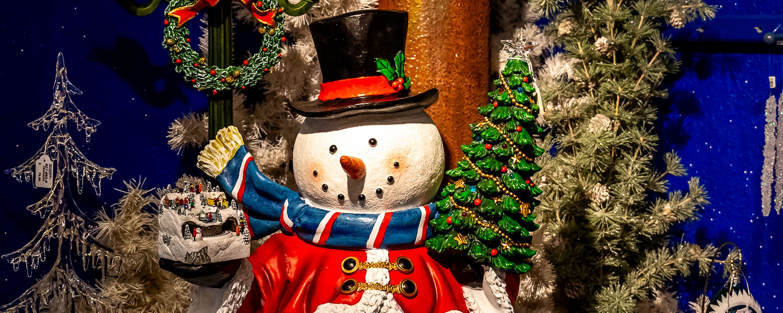 Download 2560x1024 snowman, christmas tree, buildings, lantern, new year, christmas, decorations wallpaper, background ultrawide monitor