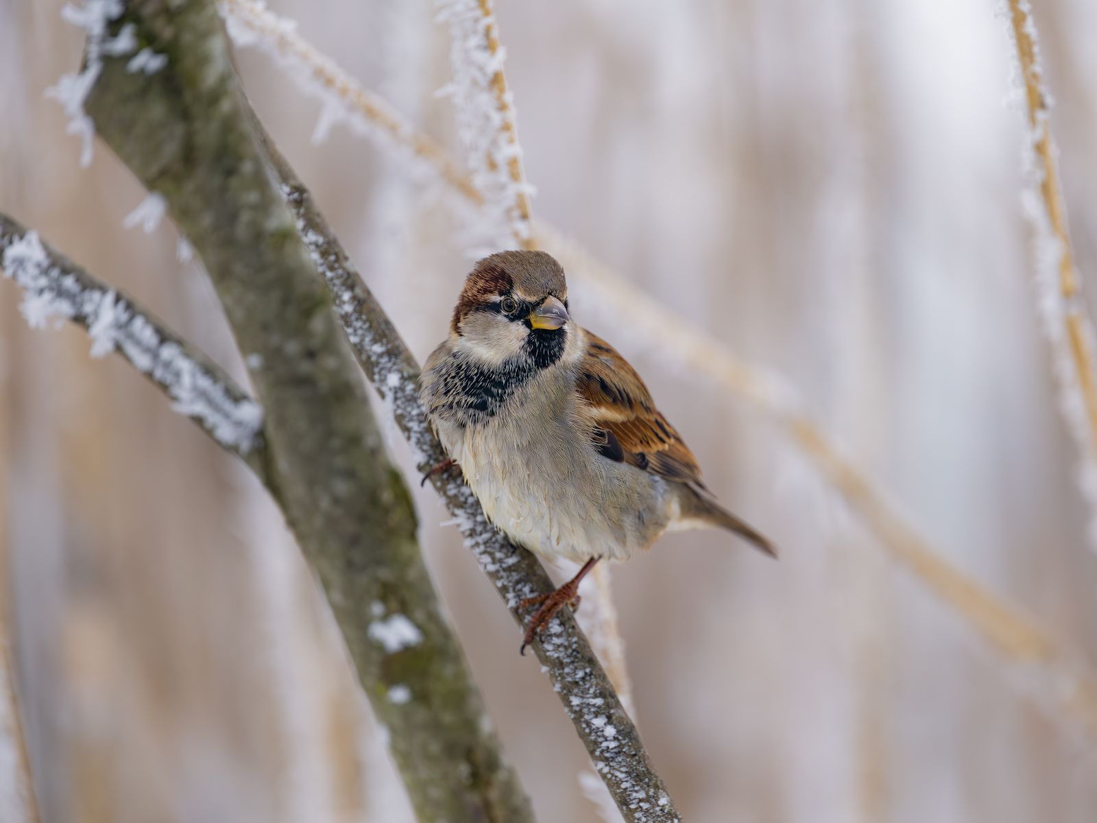 Download 1600x1200 sparrow, bird, branch, winter, blur wallpaper, background standard 4:3