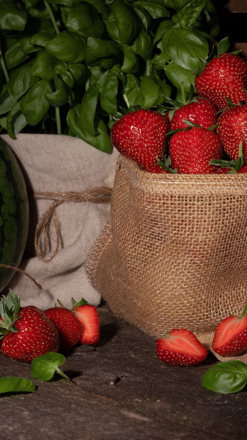 Download 800x1420 strawberries, berries, red, ripe, leaves, bag wallpaper, background iphone se/5s/5c/5 for parallax