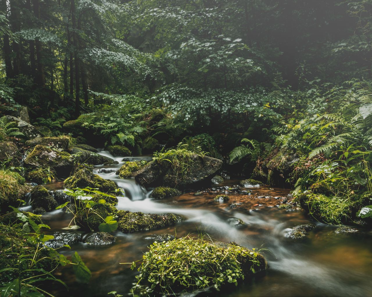 Download 1280x1024 stream, stones, grass, plants, leaves, forest wallpaper, background standard 5:4