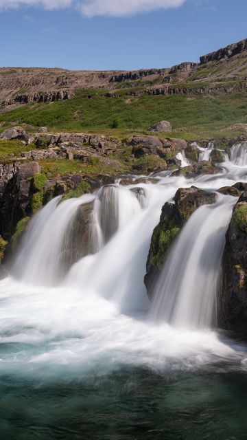 Download 360x640 stream, waterfall, stones, grass, spray, slope, nature wallpaper, background nokia n8, c5, c6, c7, e7, x6 nokia 5800, 5230, 5228, sony ericsson vivaz