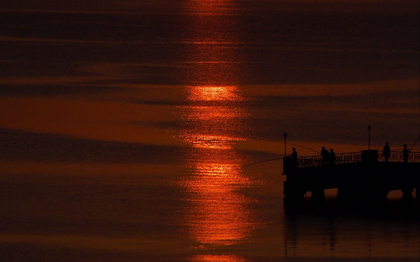 Download 1440x900 sunrise, sun, silhouettes, fishermen, sea wallpaper, background widescreen 16:10