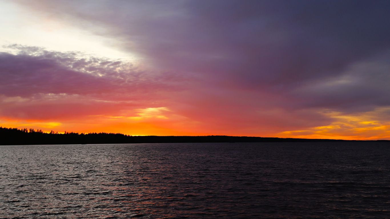 Download 1366x768 sunset, sky, clouds, horizon, lake, water, landscape, nature wallpaper, background tablet, laptop