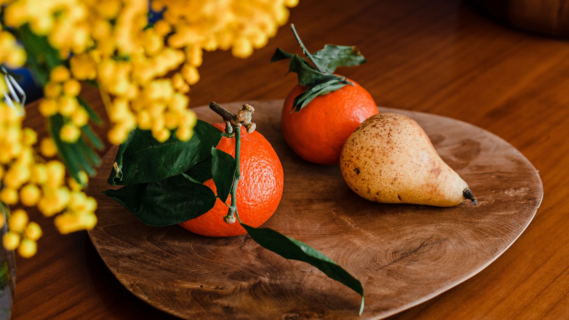 Download 1920x1080 tangerines, pear, fruits, mimosa, flowers, bouquet wallpaper, background full hd, hdtv, fhd, 1080p
