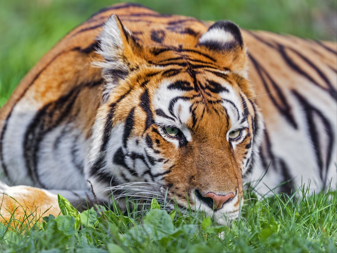 Download 1152x864 tiger, head, striped, big cat, grass wallpaper, background standard 4:3