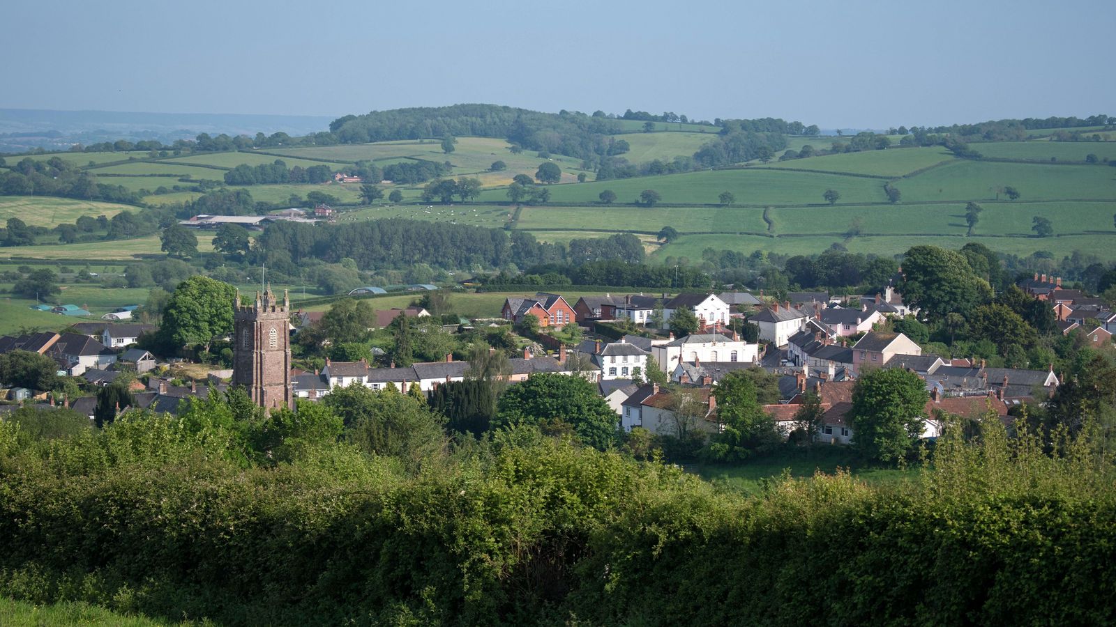 Download 1600x900 tower, houses, trees, village wallpaper, background widescreen 16:9