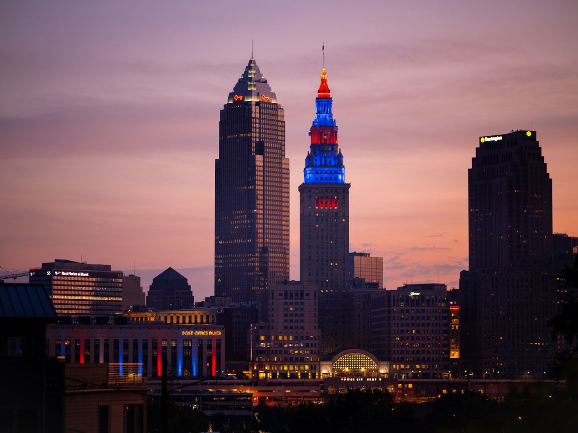 Download 1152x864 towers, buildings, lights, city, twilight wallpaper, background standard 4:3