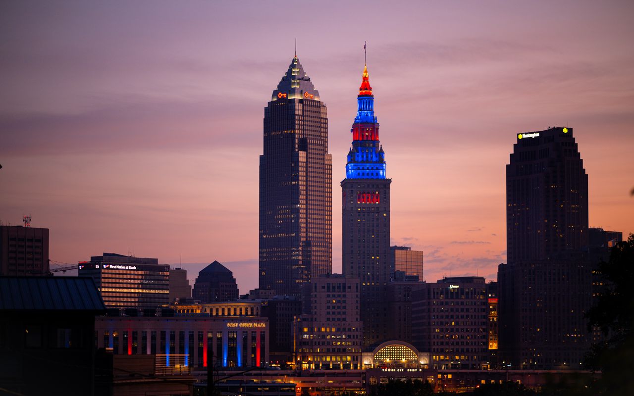Download 1280x800 towers, buildings, lights, city, twilight wallpaper, background widescreen 16:10