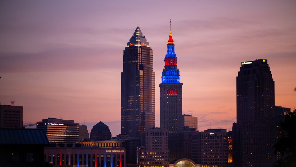Download 960x544 towers, buildings, lights, city, twilight wallpaper, background playstation ps vita