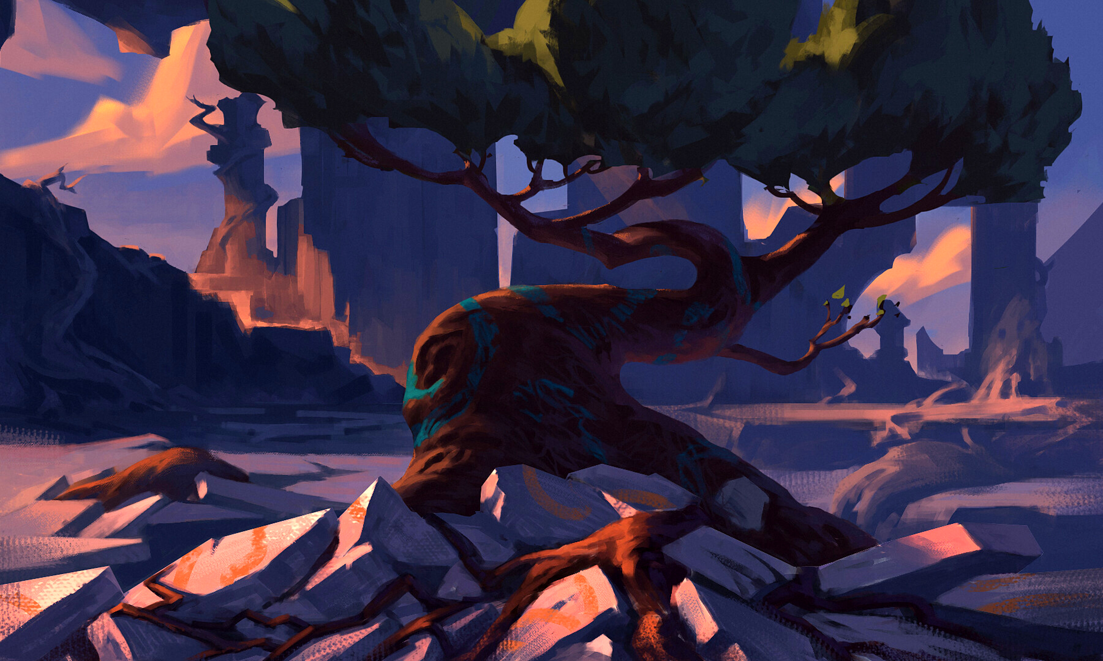 Download 3602x2160 tree, ruins, fantasy, art wallpaper, background